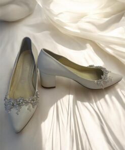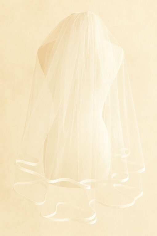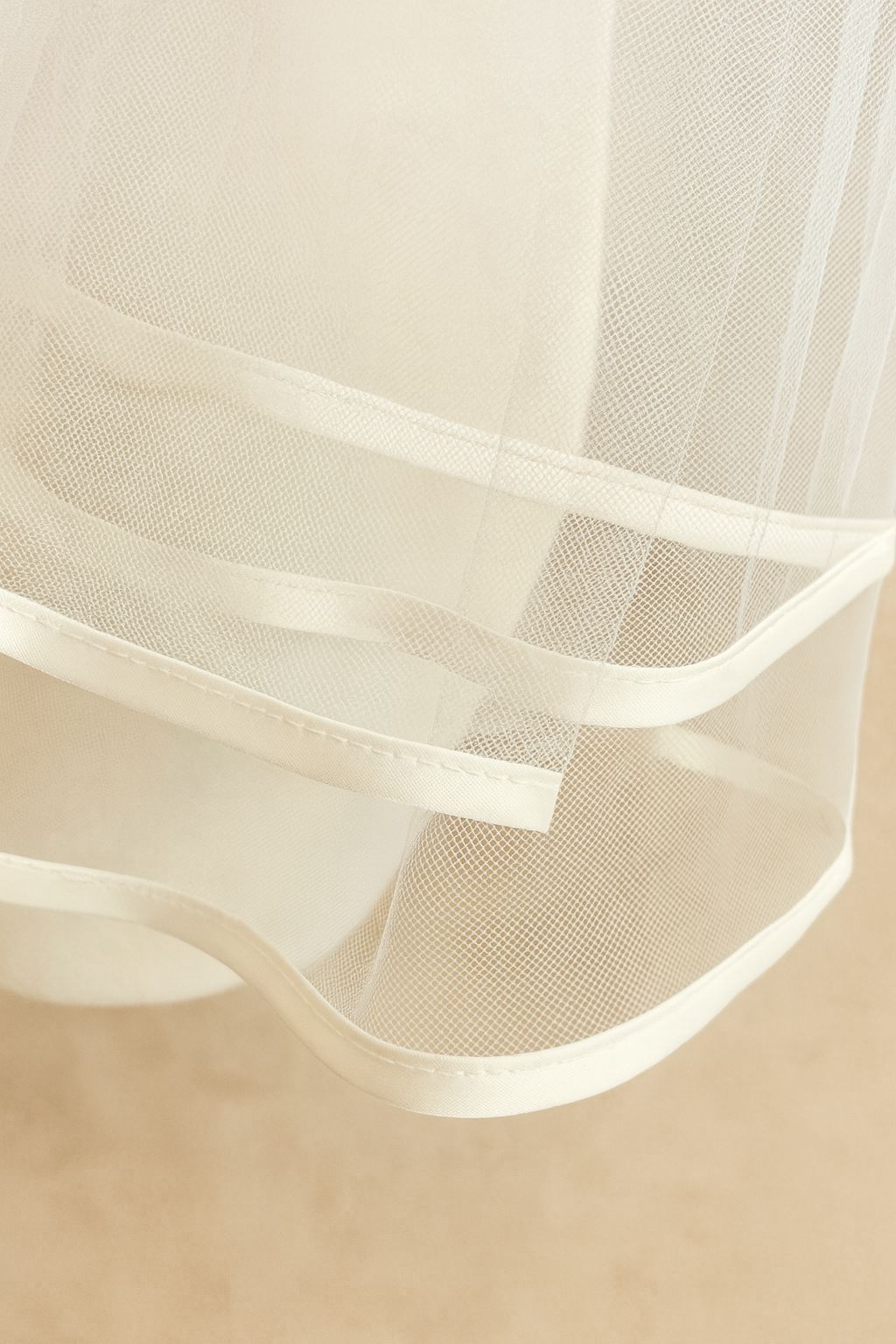 Velo corto de novia confeccionado en tul ligero con borde satinado. Su diseño clásico y versátil complementa a la perfección vestidos modernos o tradicionales, aportando un toque de elegancia y frescura.