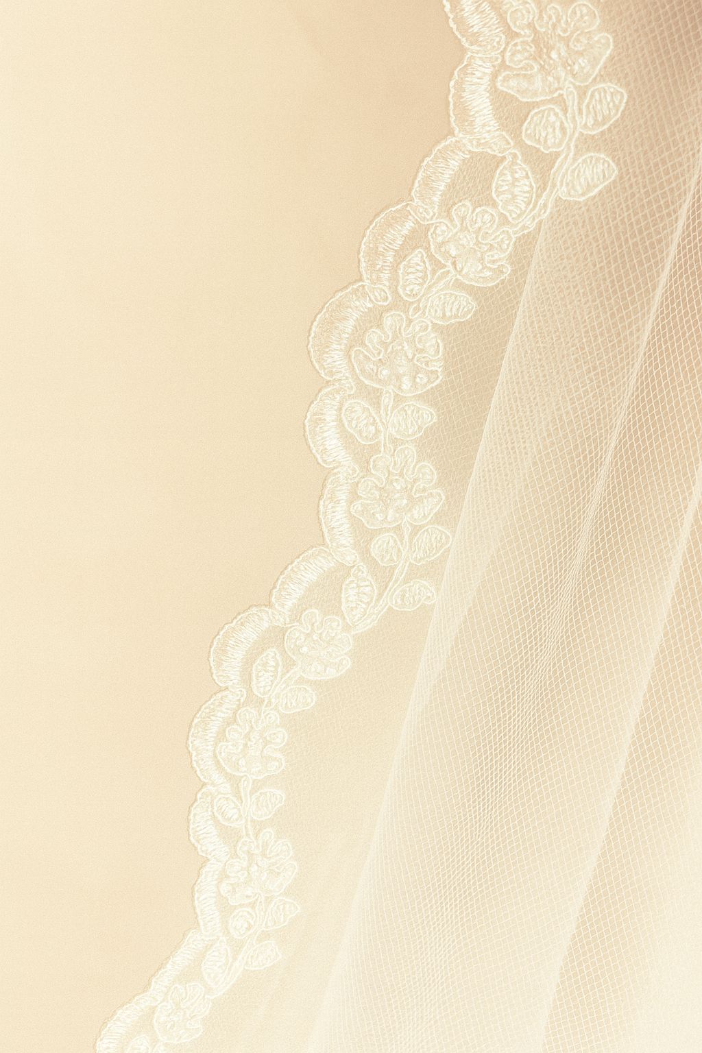 Velo corto de novia con delicado borde de encaje floral bordado, confeccionado en tul suave de caída natural. Su diseño clásico y romántico enmarca con sutileza el rostro y los hombros, aportando un toque de elegancia sin perder ligereza.