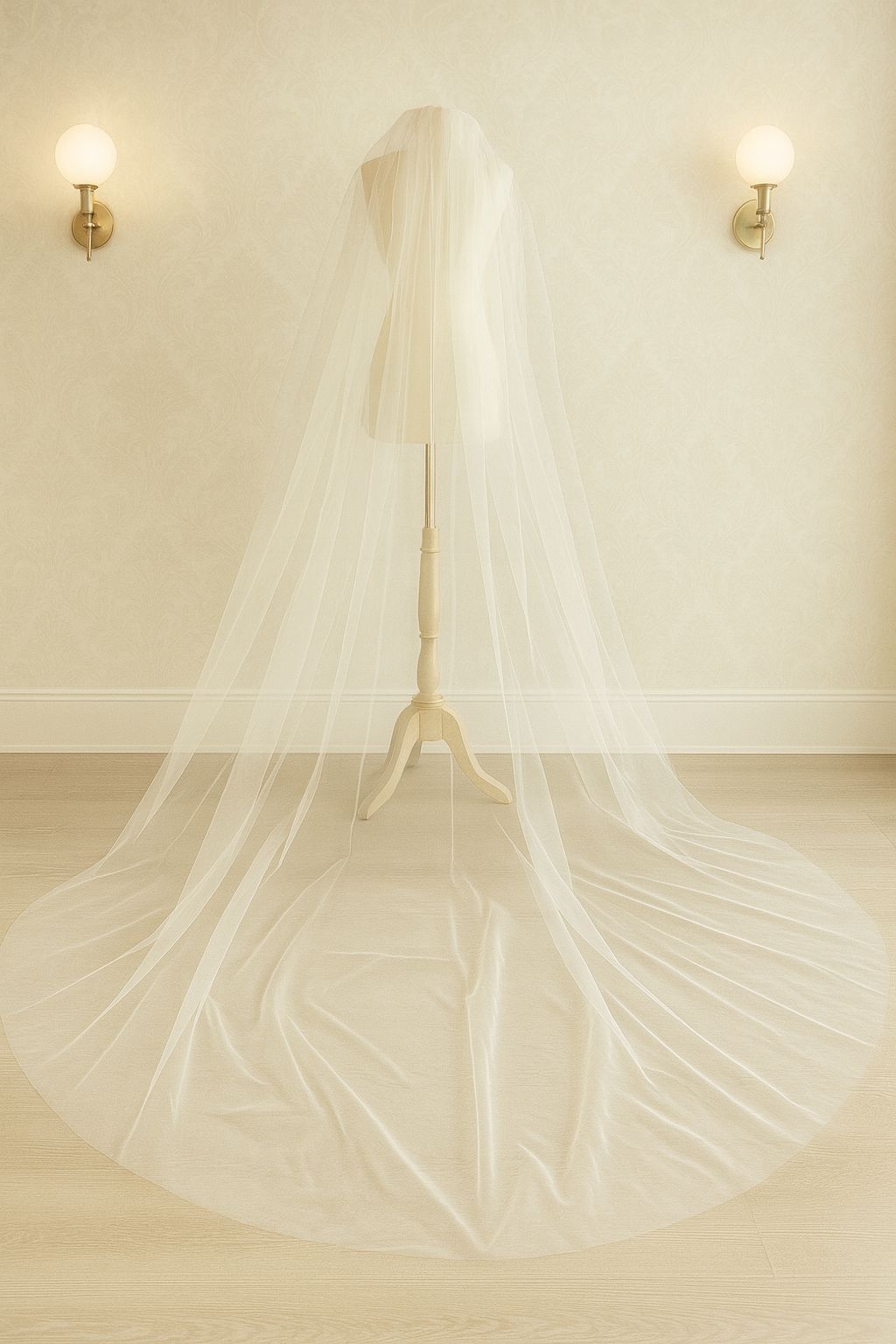 Velo de novia estilo catedral confeccionado en tul italiano de caída ligera y elegante. Su diseño liso y minimalista resalta la pureza y sofisticación del look nupcial, ideal para novias que buscan un acabado etéreo y atemporal.