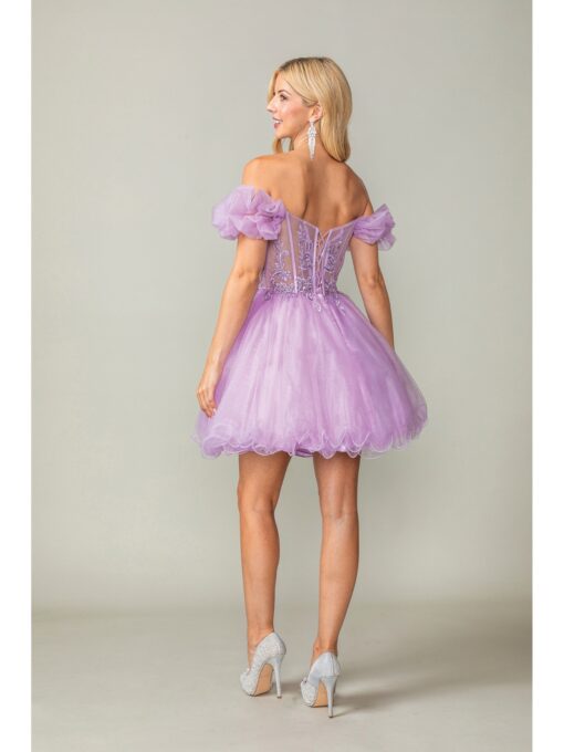 Un vestido corto digno de un cuento de hadas. Su tono lila pastel, con sutil brillo, resalta la feminidad y frescura de quien lo porta. El corset con transparencias y delicados bordados realza la figura, mientras las mangas abullonadas caen suavemente sobre los hombros, aportando un toque romántico. La falda con volumen de tul añade movimiento y encanto, ideal para una quinceañera moderna o una invitada que desea brillar con elegancia y dulzura.
